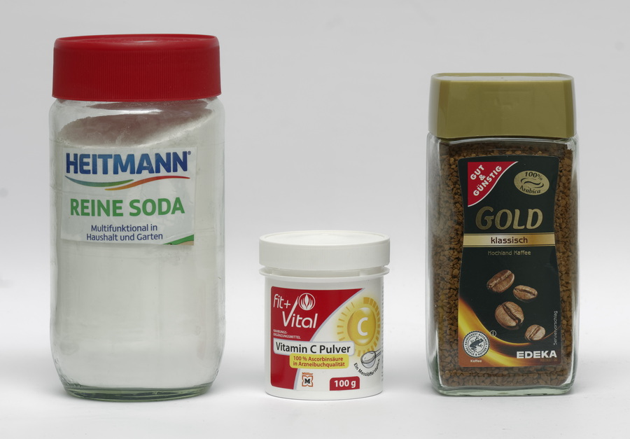 Caffenol basiert auf drei Hauptzutaten, nämlich löslichem Kaffee, Waschsoda (Natriumcarbonat) und Vitamin-C-Pulver (Ascorbinsäure). Optional kann etwas Kaliumbromid hinzugefügt werden, um Schleierbildung bei empfindlicheren Filmen zu verhindern.