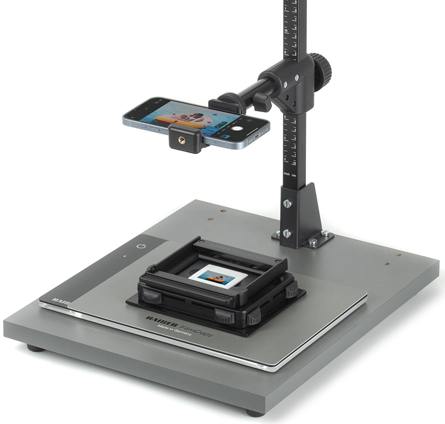 Die Kamera wird direkt am Stativgewinde befestigt, während eine mitgelieferte Klemme außerdem das Anbringen von Smartphones ermöglicht. Als Filmhalter dient Kaisers bewährte Negativbühne, die im Lieferumfang Masken für gerahmte Kleinbilddias und 35-mm-Filmstreifen enthält. Optional sind weitere Masken für Formate bis 6 × 7 cm sowie Glasplatten erhältlich. Für eine gleichmäßige Beleuchtung sorgt ein dimmbares LED-Panel (Slimlite Plano) mit einer Farbtemperatur von 5000 K, einem Farbwiedergabeindex CRI = 95 und einer großzügigen Leuchtfläche von 22 × 16 cm.