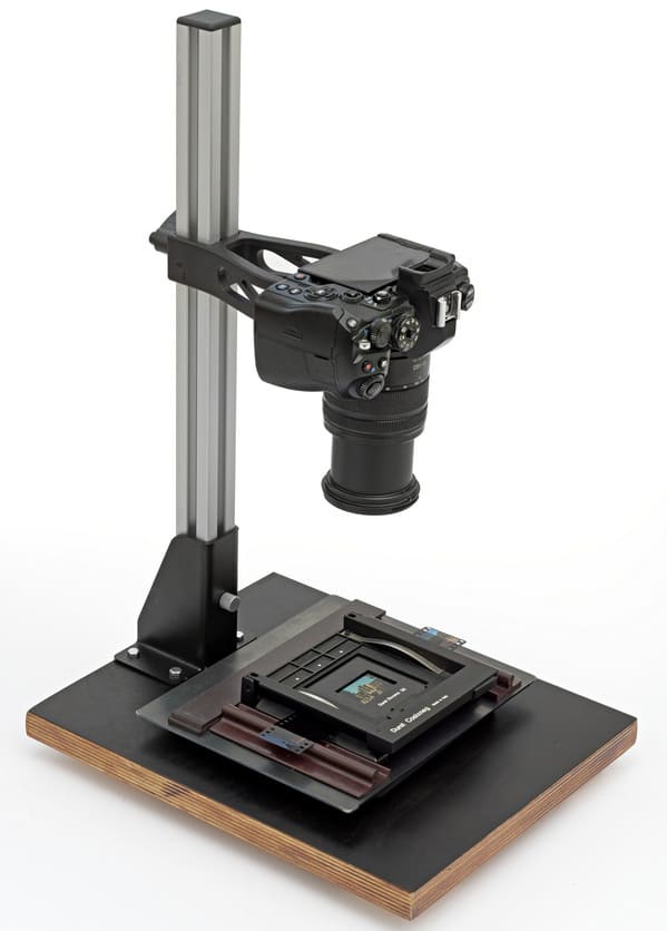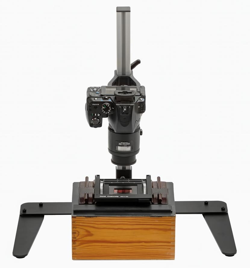 Der Standfuß unterscheidet sich deutlich: Statt eines klassischen Grundbretts verwendet Valoi eine u-förmige Metallkonstruktion. Sie kann direkt auf einen Leuchttisch gestellt oder mit einem größeren Leuchtpaneel kombiniert werden. Dadurch eignet sich das System besonders gut für das Erfassen von Dias und Negativen in Hüllen sowie für die Erstellung digitaler Kontaktabzüge.