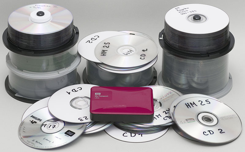 Einzelne externe 2,5" Festplatten mit 2 bis 5 TB speichern jeweils die Daten vieler CDs oder DVDs. Sie vereinfachen die Dateiverwaltung und beanspruchen weniger Platz. Eine externe 2,5" / 5 TB Festplatte war 2022 für 110 € zu haben.