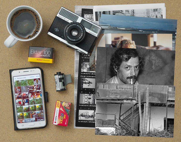 Analoge Fotografie. Filme und Abzüge neben einem Smartphone