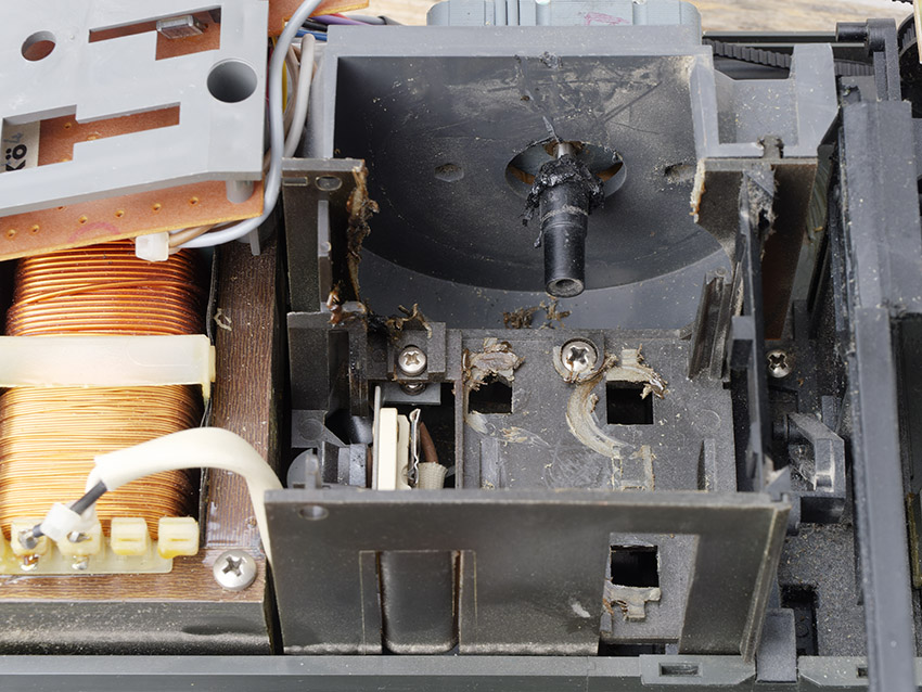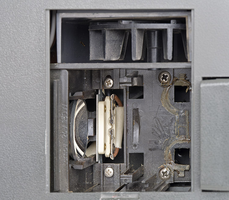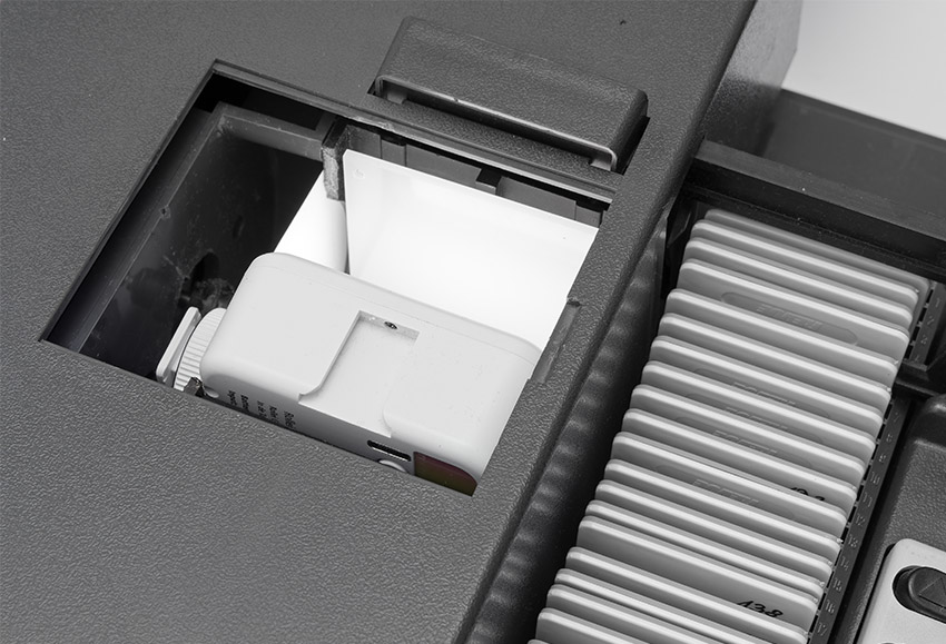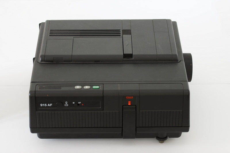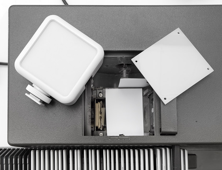 Diaprojektoren haben einen Schacht für eine austauschbare Halogenbirne, deren Licht ein optisches System passiert, bevor es das Dia erreicht. Diese Leuchtquelle ist stark genug für eine brillante Projektion des kleinen Bildes auf eine große Leinwand. Zum Abfotografieren der Dias ist sie aber viel zu kräftig und das gerichtete Licht des optischen Systems betont Kratzer und Staub. Wir benötigen eine schwächere, gleichmäßige und diffuse Beleuchtung.Braun Multimag 915 AF Diaprojektor. Der Lichtschacht wird durch das Abnehmen der oberen Abdeckung geöffnet. Das ist seitens des Hersteller so vorgesehen, um durchgebrannte Halogenbirnen austauschen zu können. Die optischen Elemente sind ebenfalls nur eingesteckt, um zur Reinigung entnommen werden zu können.