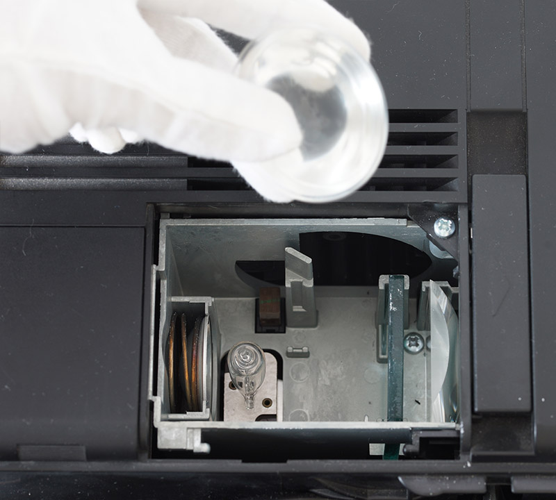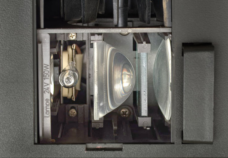 Blick in den vollen Lichtschacht eines Leitz Pradovit R150. Das Innere ist bei vielen Diaprojektoren ähnlich gestaltet.