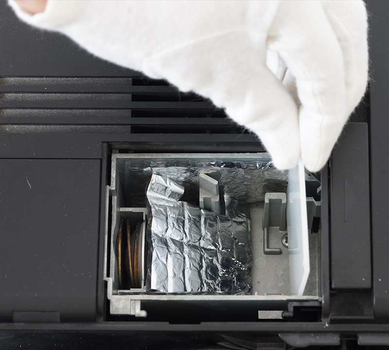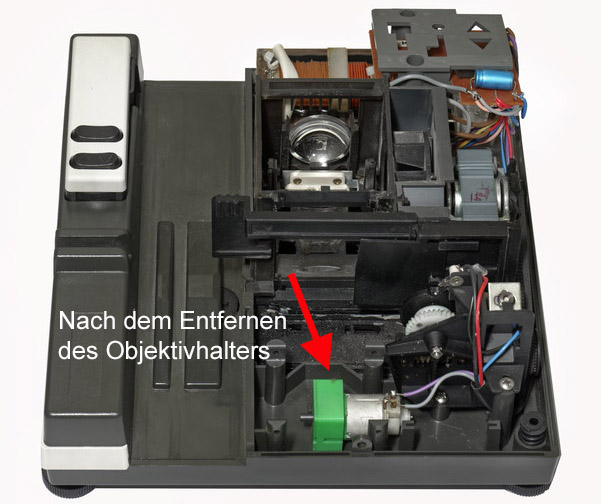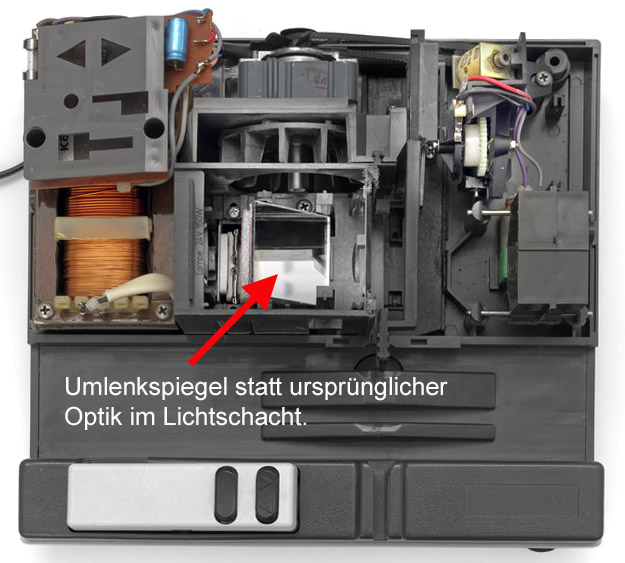 Für einen permanenten Umbau werden auch der Motor entfernt und die Halterungen für die Streben der Objektivhalterung mit einem Dremel abgetrennt, um die Bahn völlig frei zu machen. Der Bereich zwischen der kreisrunden Öffnung für das Projektionsobjektiv und dem Dia im Projektor unter der Abdeckhaube kann nach kompletter Leerung mit dunklen matten Karton ausgekleidet werden, um Streulicht und Reflexe zu vermeiden.