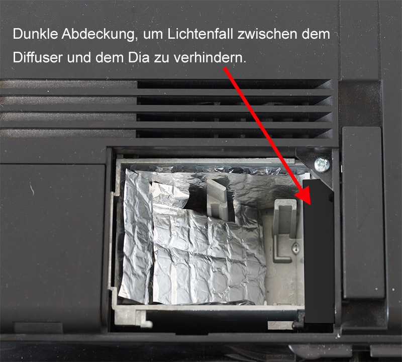 Vor dem Dia wird eine Streulichtscheibe eingesteckt und der restliche Raum mit einem reflektierenden Material ausgekleidet.