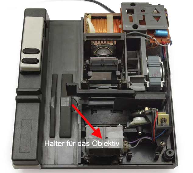 Außerdem ist das Projektionsobjektiv zu entfernen, damit die Digitalkamera mit ihrem eigenen Objektiv durch die Öffnung das das beleuchtete Diapositiv fotografieren kann. Unter der angeschraubten Haube des Diaprojektors befindet sich die Halterung für das Projektionsobjektiv. Auch sie sollte entfernt werden, um den Blick von außen auf das Dia nicht zu behindern.