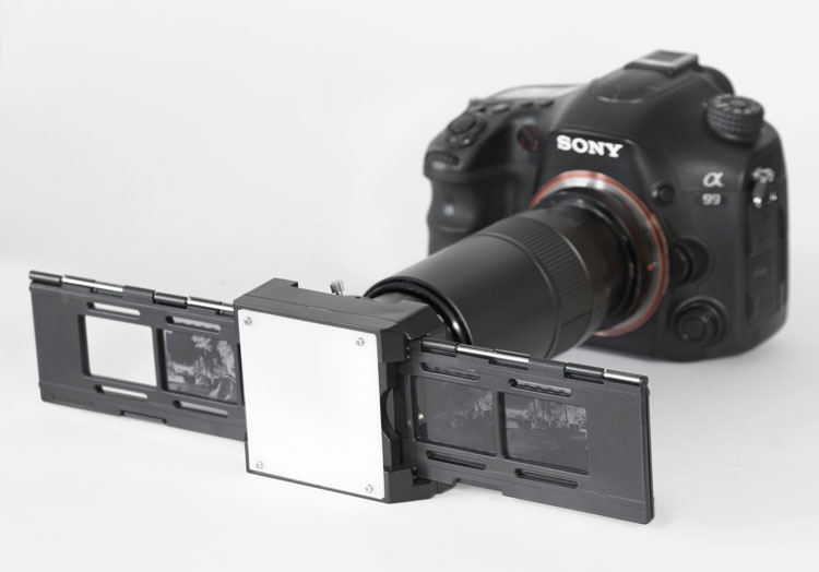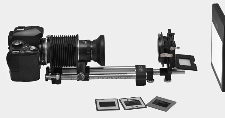 Abfotografieren statt auf herkömmliche Weise zu scannen, bedeutet eine enorme Zeitersparnis und die Bildqualität ist hoch. Mit einem einfachen Aufbau gelingt das Digitalisieren von Kleinbildvorlagen, also den üblichen Dias und Negativen, sehr gut. Sogar von Mittelformaten lassen sich so gute Repros mit der DSLR erzeugen.