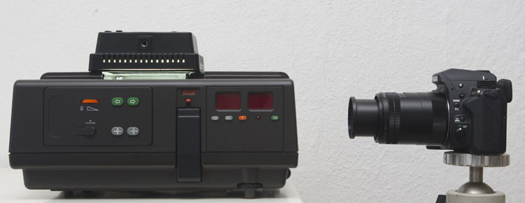 Kamera an einem Balgengerät mit Vergrößerungsobjektiv mit Halter für Dias und Negative vor einer Leuchtplatte. Dieser Aufbau eignet sich sehr gut zum Abfotografieren der Vorlagen. Die Streulichtscheibe an Filmhalter wird weggeklappt, da sich darauf Staub befindet, der auf dem Bild zu sehen sein kann. Das diffuse Licht der ca. 10 cm hinter der Vorlage befindlichen LED Lichtquelle benötigt keine Streuscheibe am Balgengerät.