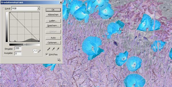 Man kann die Gradationskurve total kippen. Dadurch entsteht ein Negativ. Die vormals hellen Tonwerte werden dadurch dunkel und die dunklen werden hell. Beim Umkehren der Tonwerte verändern sich die Farben zu ihren Komplementärwerten.