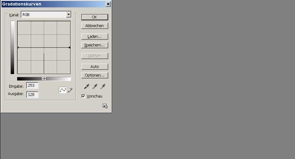 Durch Senken des Punktes aus der rechten oberen Ecke zur Mitte wird das Bild von Schwarz bis zu mittleren Tonwerten gebildet. Das Histogramm wird auf die linke Hälfte zusammengestaucht.