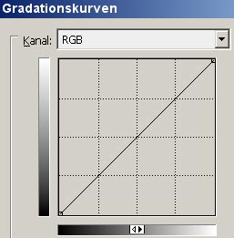 Ruft man die Gradationskurve auf, erscheint ein quadratisches Feld, durch das eine Diagonale von links unten nach rechts oben verläuft. Links neben und unterhalb des Feldes sieht man zwei von Schwarz nach Weiß verlaufende Balken. In der Mitte des unteren Balkens gibt es ein kleines Schaltfeld mit je einem weißen und schwarzen Dreieck. Durch Klicks darauf kann man entscheiden, ob der Schwarz-Weiß-Verlauf links mit Schwarz oder Weiß beginnt. üblicherweise ist Schwarz links und sämtliche Erklärungen zur Gradationskurve bzw. hier dargestellte Musterkurven gehen davon aus, daß der Schalter so eingestellt ist.