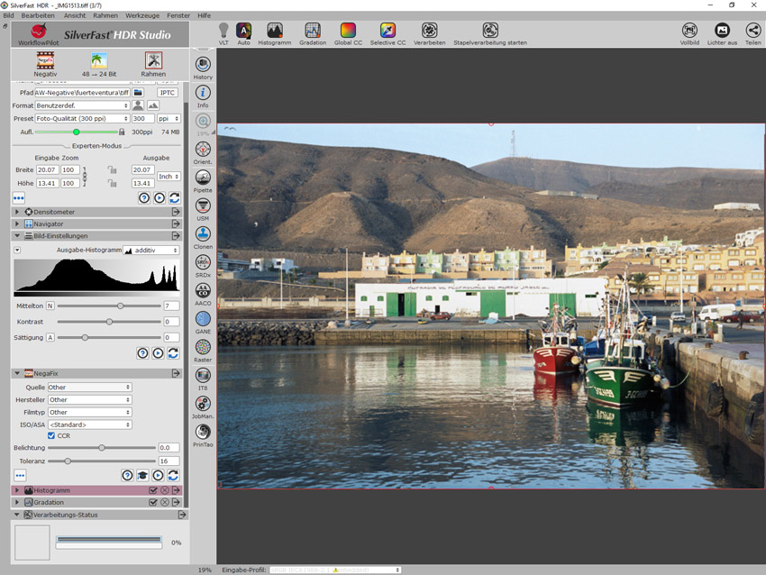 Die Werkzeuge von SilverFast HDR können genutzt werden, um negative Dateien mit natürlich wirkenden Farben zu invertieren. Allerdings kann SilverFast HDR keine RAW-Dateien interpretieren. Diese müssen zuvor zu TIF-Dateien umgewandelt werden. Prinzipiell kann man das mit dem RAW-Konverter machen, aber bessere Farben erzielt man durch lineare Tiffs.