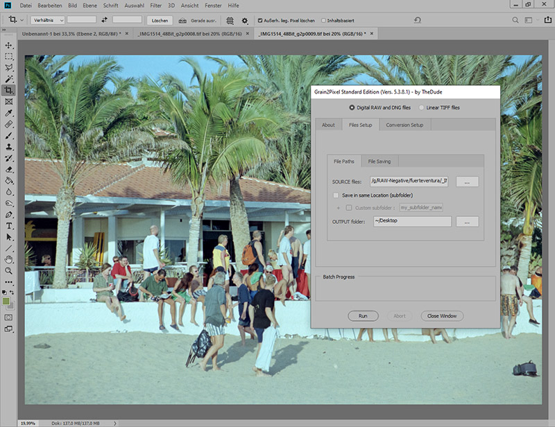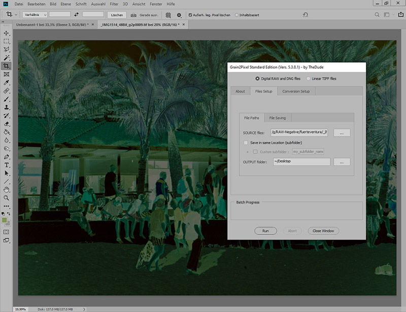 2022 © Thomas GadeGrain2Pixel ist ein Skript für Adobe Photoshop, um Dateien von abfotografierten Negativen und auch von Scannern in positive Bilder umzuwandeln. Es kann kostenlos herunterladen und genutzt werden.