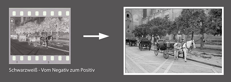 Bei Schwarzweißnegativen entfallen die Farben. Deshalb sind sie mit RAW-Konvertern und Photoshop leicht zu bearbeiten. Zunächst werden die Tonwerte umgekehrt. Anschließend passt man die Helligkeit und den Kontrast an. Damit ist die Entwicklung zum Postiv im Wesentlichen beschrieben.