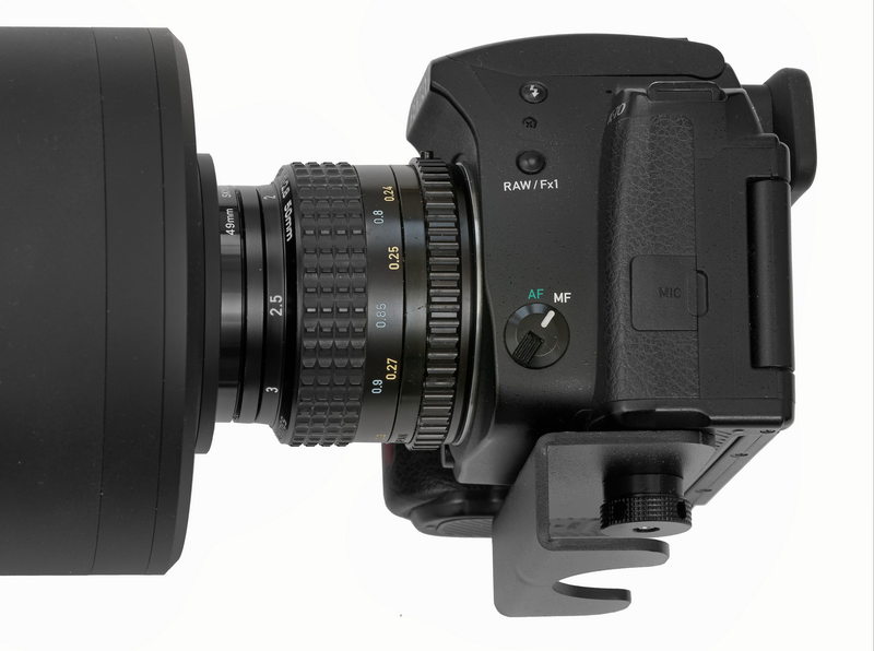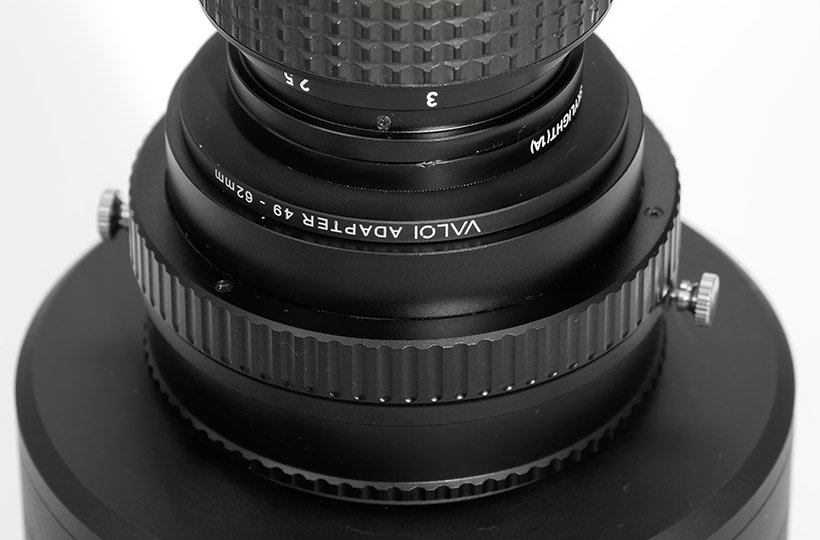 Um das Objektiv ein paar Millimeter anzuheben, wurde als zusätzlicher Distanzring die Fassung eines anderen 49mm Filters verwendet. Zwischen dem Objektiv und dem Kameragehäuse befindet sich ein Helicoid (Scharfstellschnecke) von Pentax, weil die Naheinstellgrenze des Objektivs nicht ganz ausreicht. Er ist robuster und schwergängiger als die Fokus-Mechanik im Objektiv. Bei diesem Setup wird manuell scharfgestellt und auch abgeblendet. Bequemer wäre Pentax K Zwischenring mit Übertragung der Steuerung durch die Kamera. Die Kombination eignet sich gut zum Abfotografieren von 35 mm Filmstreifen, auf denen mindestens 4 Aufnahmen im Format 24 x 36 mm sein sollen.