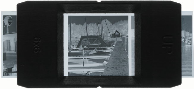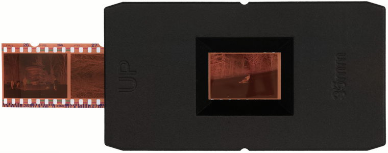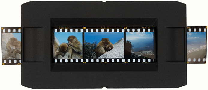 35 mm Panoramic Holder. Halter für Kleinbild-Filmstreifen. Der Filmrand ist sichtbar. Er befindet sich nicht in einer stützenden Rille. Dadruch leidet die Planlage und es ist schwierig den Film im Halter zu platzieren. Für solche Vorlagen ist ein aufklappbarer Halter mit zwei Glasscheiben besser. Dieser Filmhalter ist keine gute Idee, er schadet dem Ruf des Systems.