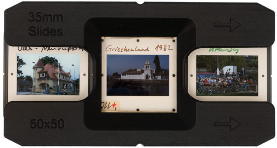 35 mm Slide Holder / Halter für gerahmte Dias. Ihre Dicke kann zwischen 0,8 mm und 5 mm variieren. Dünnere Rahmen schieben das mittlere Dia nicht immer weiter, sondern geraten darüber. Das Durchschieben klappt nicht. Mit dünnen Diarahmen, wie CS Rahmen oder die Papprahmen historischer Agfa und Kodak Dias, ist das Handling keinesfalls 'easy'.
