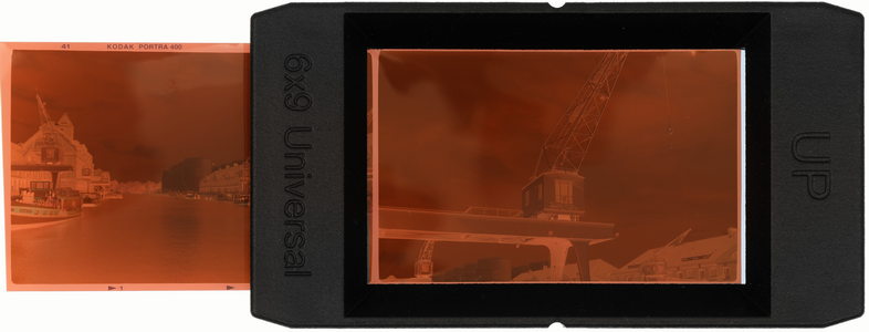 6 x 9 Universal Holder. Der universelle Halter ist beim Kauf Valoi easy120 inbegriffen und eigent sich für Vorlagen von 4.5 x 6 bis 6 x 9. Auch hier gilt, dass die Filmstreifen lang genug sein müssen, um mindestens auf einer Seite aus dem Halter heraus zu ragen. Dazu braucht man etwa drei 6 × 6 Bilder auf einem Filmstreifen.