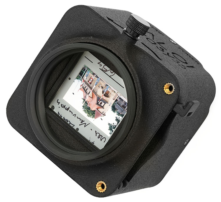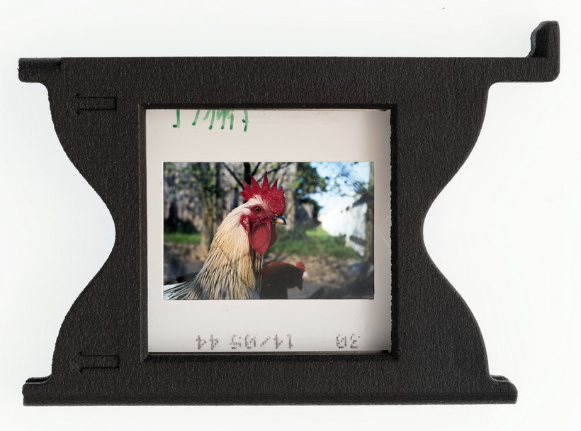 Basismodul vom Valoi easy35 mit Halter für ein gerahmtes Dia, das von hinten durch eine eingebaute LED-Leuchte beleuchtet wird. Das Gehäuse ist im 3-D-Druck hergestellt.