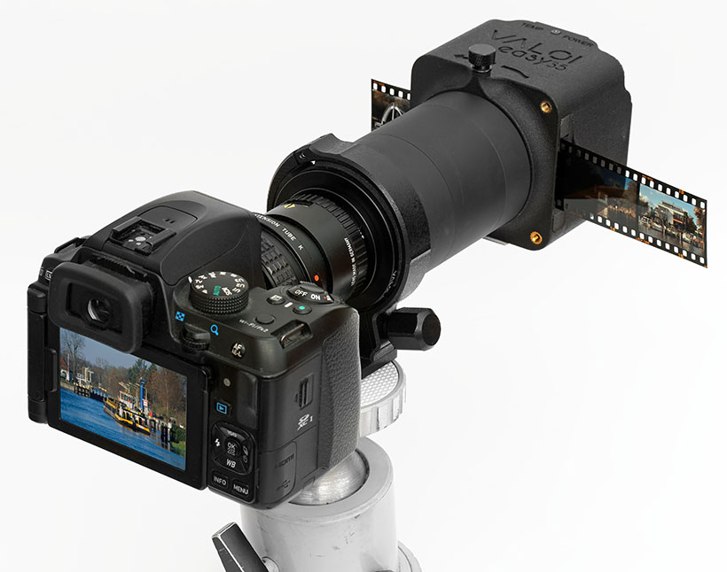 Scannen mit der Digitalkameras geht schneller als mit klassischen Filmscannern. Aber nur, wenn der Workflow und das Zubehör stimmen. Theoretisch ist der Aufbau einfach: Kameragehäuse, Makroobjektiv, Film und dahinter eine Leuchtquelle. Meistens wird dabei Reprosäule eingesetzt, wie beim Valoi 360 System.