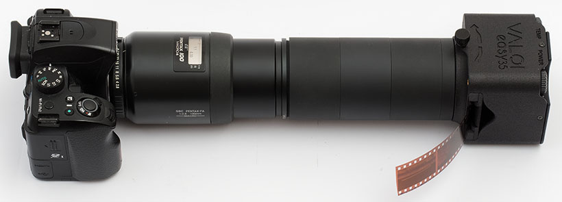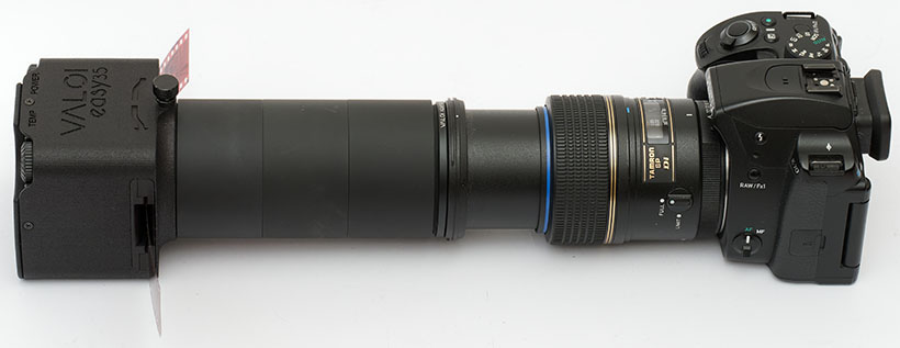Pentax K-70 mit smc Pentax FA 100 F4 Macro. Der Valoi easy35 mit den angeschraubten Distanzringen wiegt 517 g. Das Konzept ist gut, aber man braucht stabile Objektive, die durch das Extragewicht am langen Hebel nicht kaputt gehen.