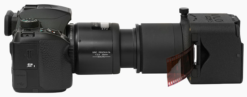 Es geht auch ohne Reprosäule. Im letzten Jahrhundert boten Hama, Kaiser, Dörr, Soligor und andere Dia-Duplikatoren an, die an Filtergewinde von Objektiven geschraubt wurden. Es waren Röhren, die auf einer Seite eine Halterung für Filmstreifen oder Dias hatten. Hinter ihnen befand sich eine Streulichtscheibe, aber keine aktive Leuchtquelle. Noch heute kann man solche Geräte kaufen, zum Beispiel den Nikon ES-2 Adapter oder den Kaiser Dia-Duplikator. Einige dieser Modelle werden mit einer abnehmbaren Nahlinse geliefert, sodass man nicht nur spezielle Makroobjektiven benötigt. Die beste Brennweite beträgt kleinbildäquivalent etwa 100 mm.Valoi easy35