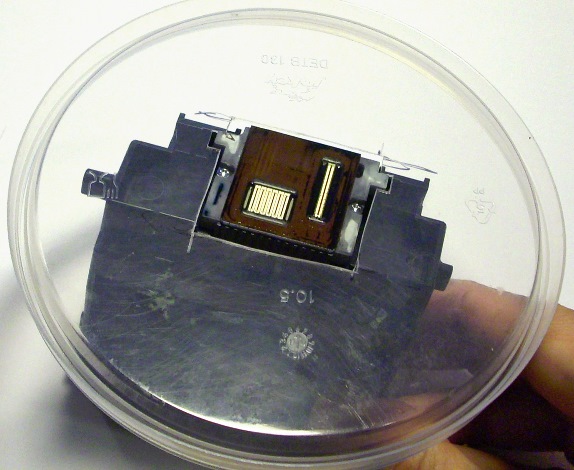 Tintenstrahldrucker haben entweder einen Druckkopf und separate Tintentanks oder sie haben Tintenpatronen mit eingebauten Druckköpfen. Es kann vorkommen, dass Druckköpfe schlecht drucken, weil ihre Tintendüsen oder Tintenkanäle durch eingetrocknete Tintenresten zugesetzt sind. Die Anbieter von Tinten bieten Flüssigkeiten mit phantasievollen Namen wie 'Düsenreiniger' an, die helfen sollen, die Tintenwege wieder freizubekommen. In der Regel reicht dafür ganz normales sauberes Leitungswasser. Die Druckköpfe aus meinen Tintenstrahlrduckern von Canon halte ich im Bedarfsfall einfach unter den Wasserhahn und lasse den Wasserstrahl auf die feinen Siebe, durch die die Tinte aus den Patronen in den Druckkopf laufen, rinnen. Dabei sollte man aufpassen, dass die elektrischen Kontakte auf der Rückseite des Druckkopfes trocken bleiben. Diese Dusche hilft meistens.Etwas schonender geht es mit Hilfe eines Plastikbechers mit Deckel. Man schneidet eine öffnung in den Deckel, durch die der etwas nach unten herausragende Teil des Druckkopfes mit den Düsen passt.
