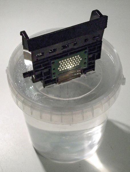Dann füllt man den Becher mit klarem, warmen (gefilterten) Wasser bis etwa einen Millimeter unterhalb des Deckels. Das geht am besten mit aufgesetztem Deckel durch dessen neue öffnung. Ein (aber wirklich nur ein!) Tropfen Spüli oder Netzmittel aus dem Fotolabor vermindert die Oberflächenspannung des Wassers und begünstigt den beabsichtigen Prozess. Anschließend setzt man den Druckkopf so in die Aussparung, dass die Düsen im Wasser sind. Man kann beobachten, wie Tintenfäden nach unten ziehen. Auf diese Weise vermeidet man Nässe auf den empfindlichen elektronischen Kontakten. Der Erfolg kann sich nach wenigen Minuten bis Stunden einstellen.