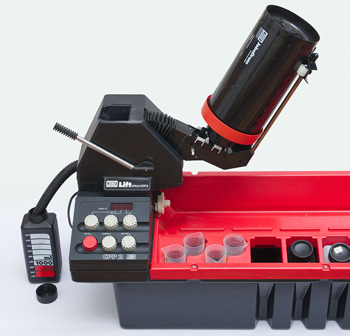 Als optionales Zubehör für die JOBO CPE-2 / 3, CPA-2 und CPP-2 / 3 gibt es den Lift. Er ist eine Hebe- und Senkvorrichtung für die Entwicklungsdose, um den Wechsel der Fotochemie im Entwicklungsprozess zu vereinfachen. Im angehobenen Zustand fließt die Fotochemie aus der Entwicklerdose in bereitstehende Behälter. Oben hat der Lift eine trichterartige Öffnung zum Eingießen der Fotochemie. Mit dem Lift enfällt das umständliche Lösen der Dose vom Antrieb zum Wechseln der Bäder.