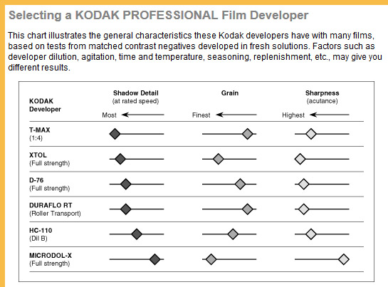 Quelle: Kodak zeigte mit dieser Grafik die Unterschiede seiner Schwarzweißfilmentwickler. Sie ist heute noch über die WaybackMachine aufzurufen: https://bit.ly/2KgnWLj