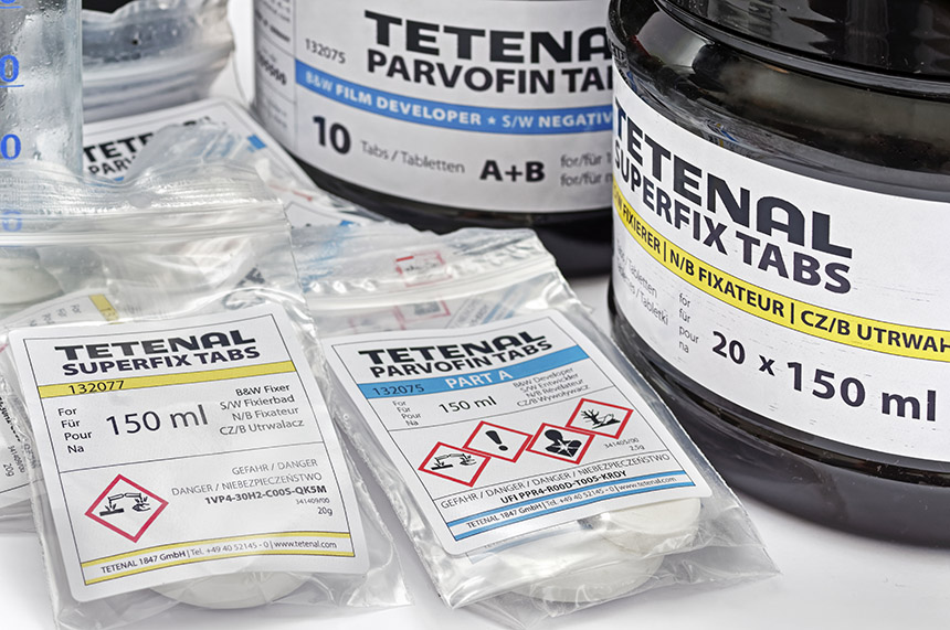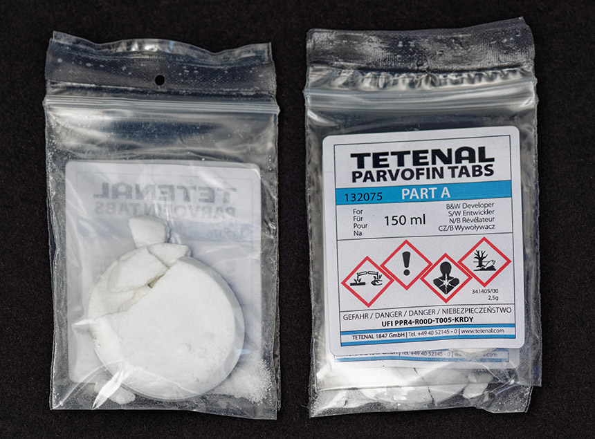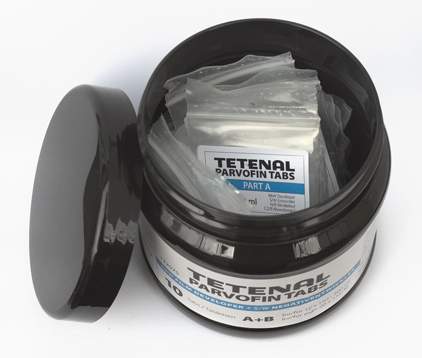 2021 brachte Tetenal einen Entwickler für Schwarzweißfilme in einer ungewöhnlichen Konfektionierung auf den Markt. Anstelle eines verdünnbaren Konzentrats oder Tüten mit Pulver, wird 'Parvofin Tabs' vom Benutzer aus zwei Tabletten mit Wasser angesetzt. Eine große und eine kleine Tablette sind jeweils separat in Plastiktüten verpackt, die widerum paarweise zusammenhängen, um Verwechslungen zu vermeiden.Passend zum Konzept gibt es auch einen Fixierer als Tabletten zum Auflösen in Wasser, nämlich Tetenal Superfix Tabs.