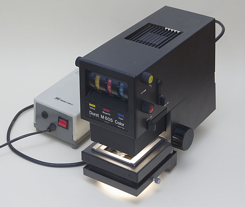 Viel attraktiver ist der Farbmischkopf CLS 605 mit einer 100 W Halogen-Kaltlichtlampe, die Strom von einem 12 V Trafo bezieht. Der CLS 605 ist nicht nur für Farbpapiere, sondern auch sehr gut für Schwarzweißabzüge geeignet. Das diffuse Licht des CLS 605 unterdrückt die Sichtbarkeit von Kratzern und Staub auf den Abzügen.