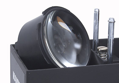Im Gegensatz zu vielen anderen Farbvergrößerern mit Mischlichtschächten bleibt der zweilinsige Kondensor über der Negativbühne im Vergrößerer. Man kann ihn leicht herausnehmen und sollte in der Praxis ausprobieren, ob das vorteilhaft ist, wenn man verkratzte Negative vergrößert, denn das gerichtete Licht des Kondensors macht Kratzer sichtbar, die von rein diffusem Licht stark unterdrückt werden.