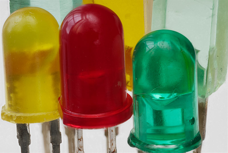 Leuchtdioden. Einzelnes Foto aus einer Belichtungsreihe mit fortlaufend leicht veränderter Scharfstellung, um vom Vordergrund bis in den Hintergrund alle Bereiche verteilt auf mehrere Bilder jeweils scharf aufzunehmen.