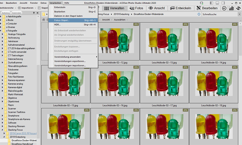 Im Modus Verwalten werden die Bilder der zu stackenden Fotos markiert. Mit Verarbeiten -> Fokus Stapel wird das Focus Stacking gestartet.