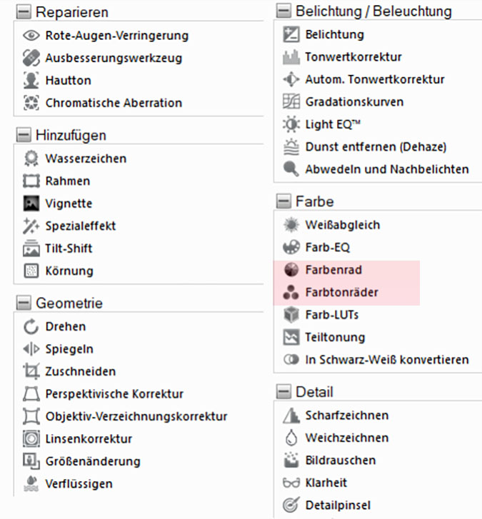 Werkzeuge in der Bildbearbeitung. Auch in diesem Modus sind Farbenrad und Farbtonräder hinzugekommen.