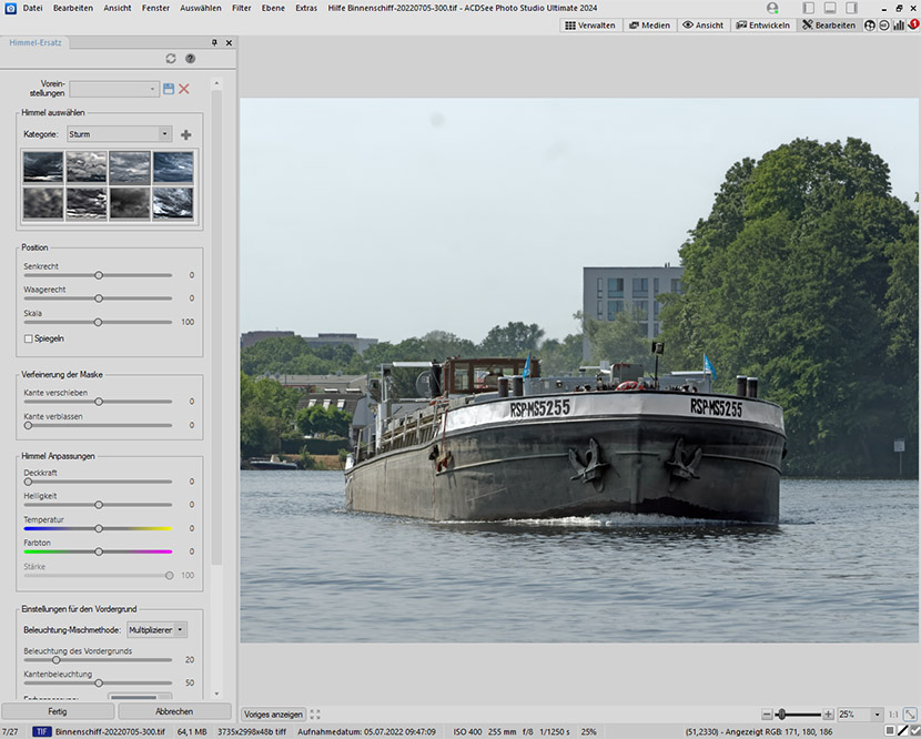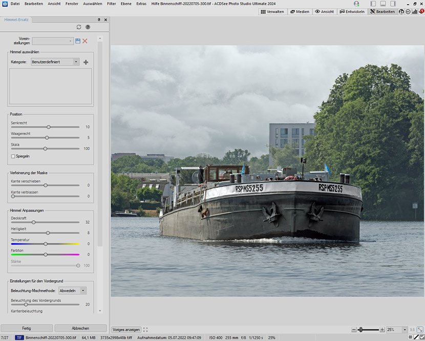 Wenn der Himmel gut vom Rest des Bildes zu unterscheiden ist, ist er leicht durch einen anderen zu ersetzen. ACDSee enthält einige Bilder. Man kann aber auch eigene hinzufügen. Die Technik funktioniert bei vielen Bildern ganz gut, aber häufig kann ACDSee nicht genau erkennen, wo der Himmel endet und andere Motive zu sehen sind. Damit muss man rechnen wenn es beim Horizont recht trübe ist und die nötigen Kontraste fehlen.