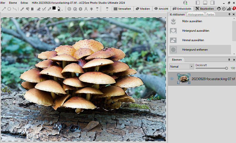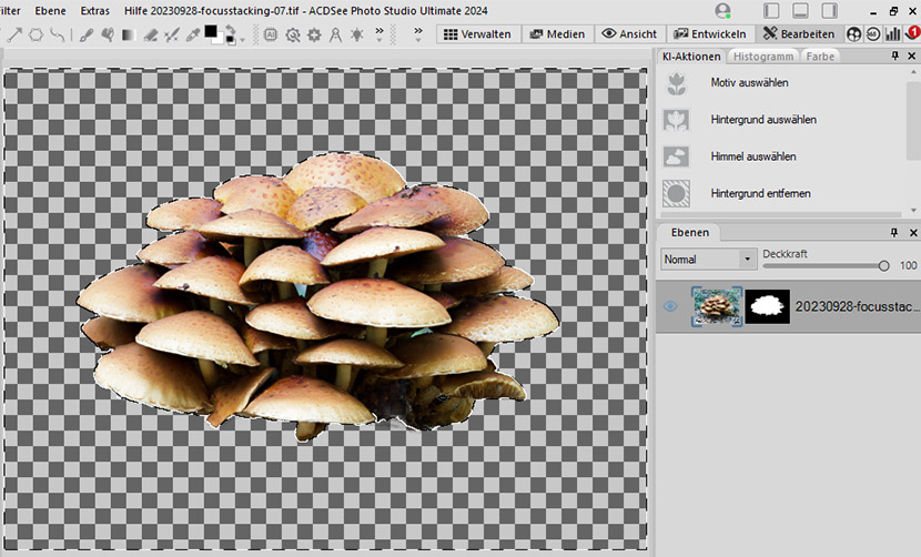Bei diesem Beispiel klappt das automatische Erkennen der Pilze und das Freistellen sehr gut.