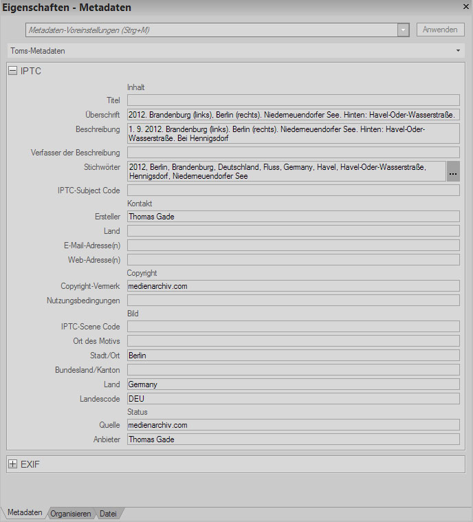 Wichtig ist unter 'Eigenschaften' das Eingabe- und Ansichtsfenter 'Metadaten'. Hier werden die IPTC-Infos eingetragen.