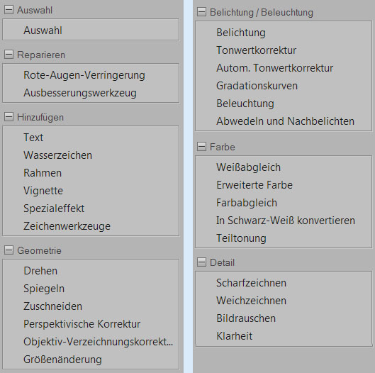 - Geometrie: Drehen, Spiegeln, Zuschneiden, Perspektivische Korrektur, Objektiv-Verzeichniskorrektur, Größenänderung