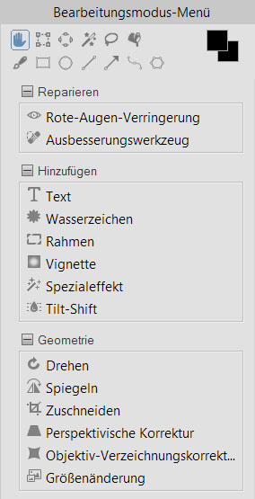 Die Liste der Bildbearbeitungsfunktionen ist lang, jedoch war sie das bereits in den Vorversionen. Besser angeboten werden die Auswahl-, Pinsel- und Linienwerkzeuge. Für sie ist es nicht mehr nötig, eigene Register aufzuklappen.![]() |