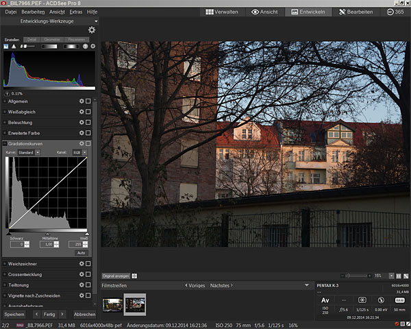 1. Die Gradationskurve sollte dauerhaft einblendbar sein, weil sie ein wichtiges Werkzeug ist. Sie bei jedem Foto immer wieder neu aufzurufen, kostet Zeit und ist lästig.