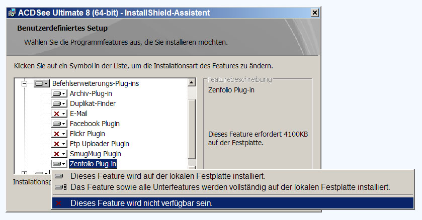 ACDSee Ultimate 8 installiert Schnittstellen zu Facebook, Flickr, Zenfolio, SmugMug und einen FTP-Uploader. Beim benutzerdefinierten Setup kann man entscheiden, ob die Schnittstellen zu sozialen Netzwerken und Fotoplattformen installiert werden oder nicht.