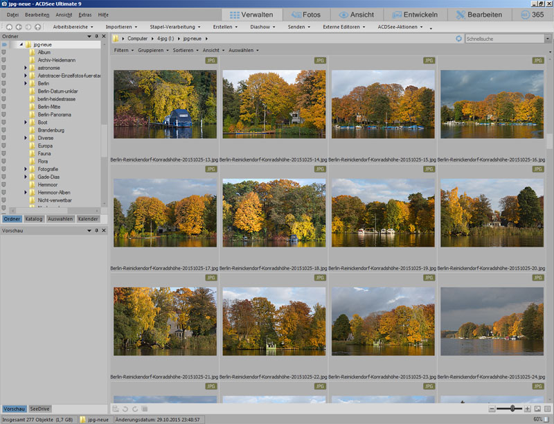 ACDSee Ultimate 9 ist ein multifunktionales Fotoprogramm mit folgenden Kernen: Bildbetrachtung, Bildbearbeitung, RAW-Konverter, IPTC / Metatexteditor, Websiteassistent und mehr.ACDSee im Verwaltungsmodus. Thumbnailübersicht in einem Album