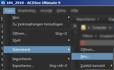 | Datenbank | C:\Users\tom\AppData\Local\ACD Systems\Catalgos\90Ult\Default.dbin Die Speicherort der Datenbank wird in diesem Menü angezeigt, kann aber nicht verschoben werden, aber man kann eine neue an einem anderen Ort erstellen. Möglich ist das hier: Datei -> Datenbank -> Neu Das sollte man unbedingt machen, denn die Datenbank kann sehr groß werden. |