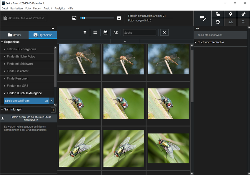 Die Suche nach 'Libelle am Schilfhalm' ergab 21 Fotos. Darunter waren drei richtige Treffer. Sie wurden in der oberen Reihe angezeigt. Offenbar sind die Bilder nach Relevanz sortiert.