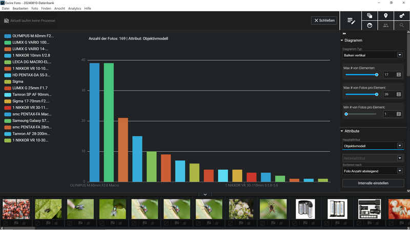Das Balkendiagramm zeigt an, mit welchen Objektiven die indizierten Fotos aufgenommen wurden. Es können nur solche berücksichtigt werden, die Exif-Daten liefern. Alte Objektive aus der Zeit vor Exif oder Mikroskope, Spektive und Teleskope, die zum Fotografieren genutzt werden, können nicht (korrekt) erkannt werden.