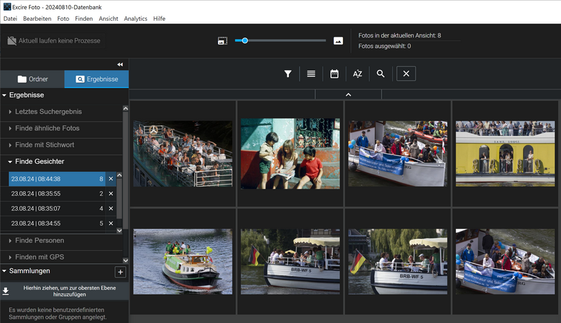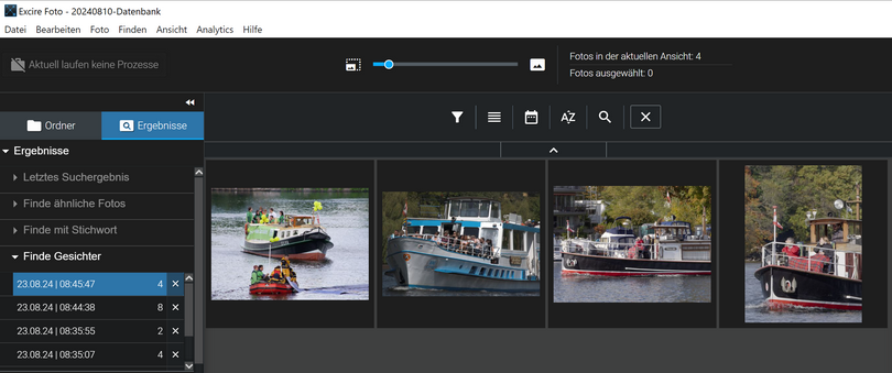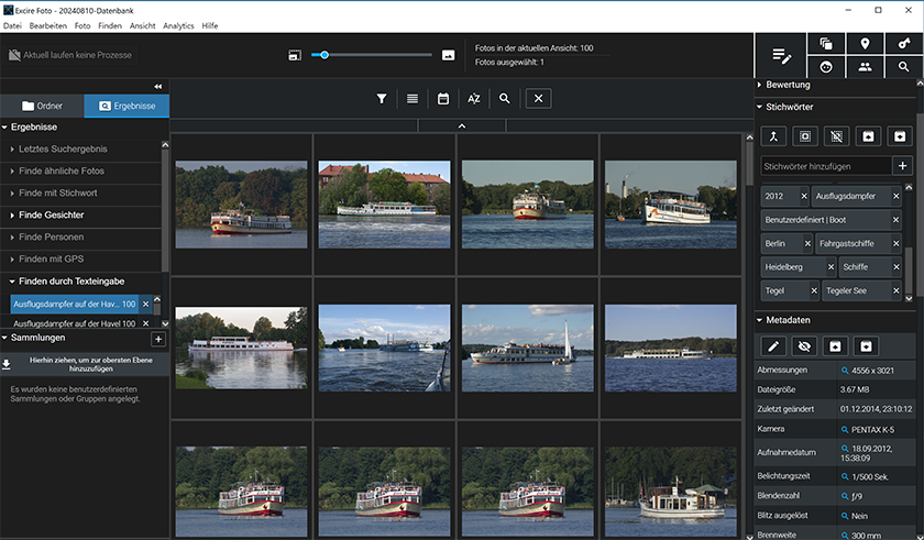 Prompt-Suche (Finden durch Texteingabe): Ausflugsdampfer auf der Havel. In den IPTC-Stichwörtern steht bei vielen Bildern als Ort der Tegeler See und nicht die Havel. Excire-Foto 2024 ignoriert solche Hinweise. Das Ähnlichkeitslimit war auf 20 eingestellt. Sogar bei der Einstellung 1 wurden Ausflugsdampfer auf anderen Gewässern als Treffer angezeigt.