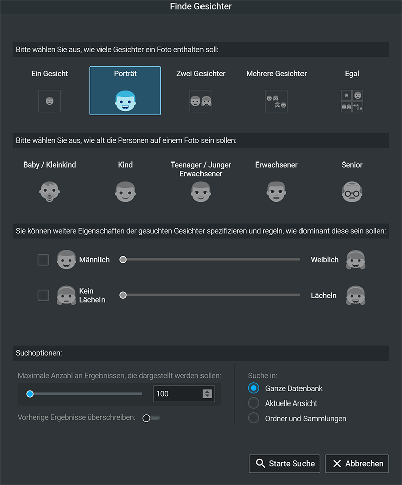 Die Suche nach Bildern mit Gesichtern kann differenziert eingestellt werden.