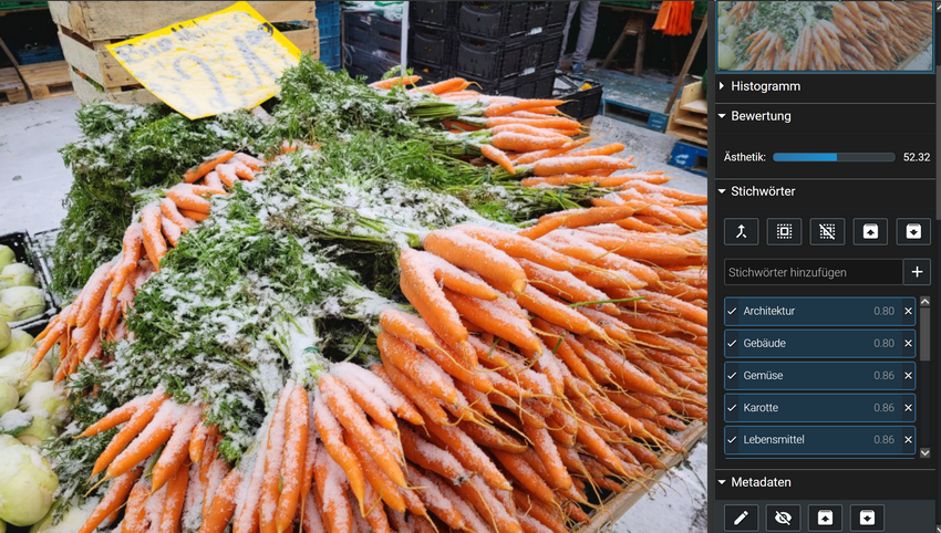 Der Schnee wird von beiden Programmen nicht erkannt und somit auch nicht die Jahreszeit Winter. In den eingebetteten IPTC-Infos steht u.a.: Berlin. Obst- und Gemüse Markt im Winter. Schnee. Wurzeln. Diese Infos werden von der KI in beiden Programmen ignoriert.